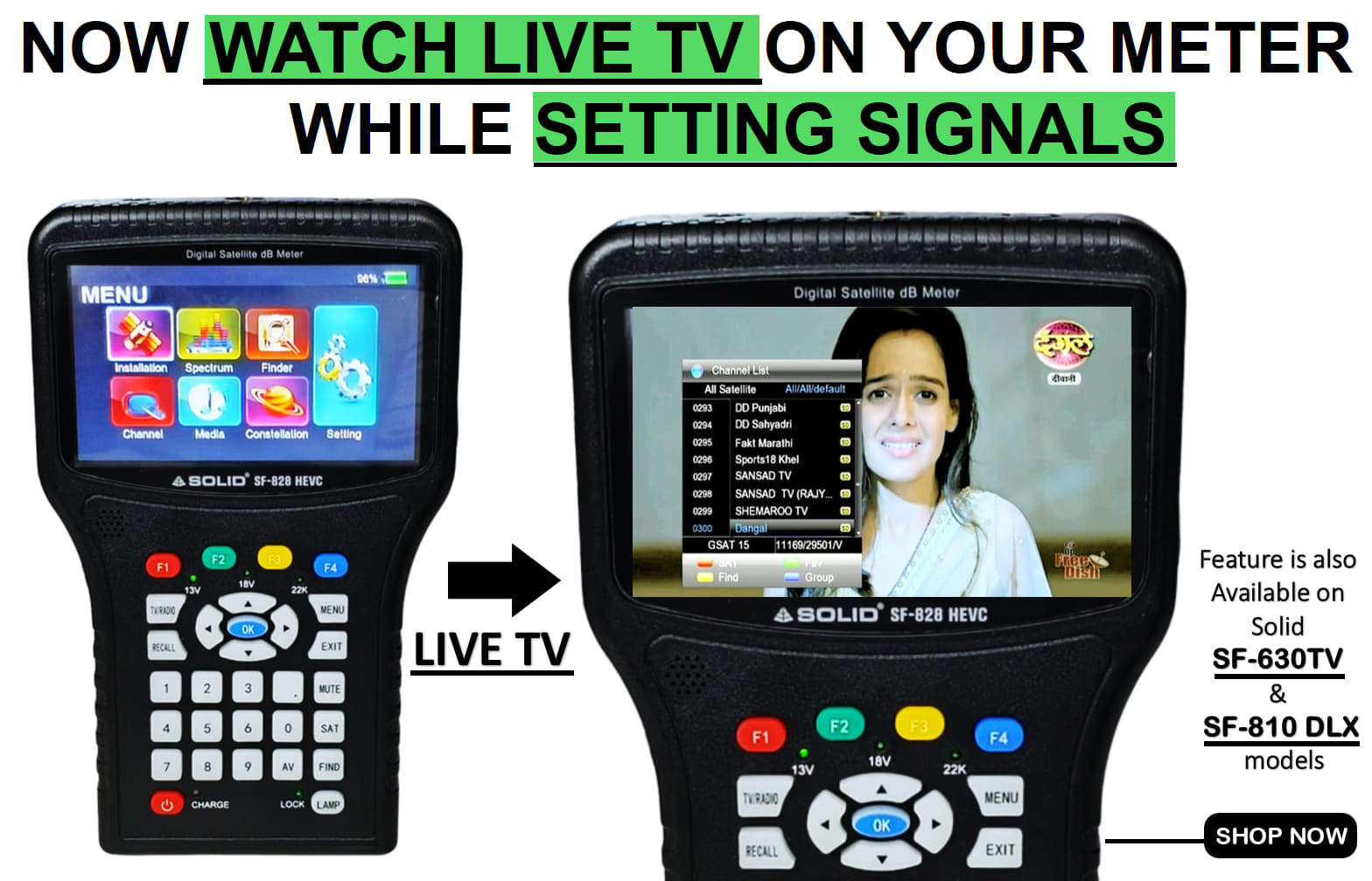 If you want to check a free-to-air TV channel's satellite signals, Audio quality, and video quality in meters, then it is the only meter where you can check satellite signals, audio quality, and video quality same time. That's why every DTH company left an FTA channel out from their satellite for testing and installation purposes.